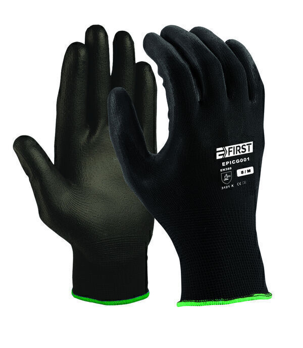 Gants support tricoté nylon. Jauge 13. Enduction polyuréthane sur la paume et les extrémités des doigts. Poignet tricot élastiqué. Qualité premium.