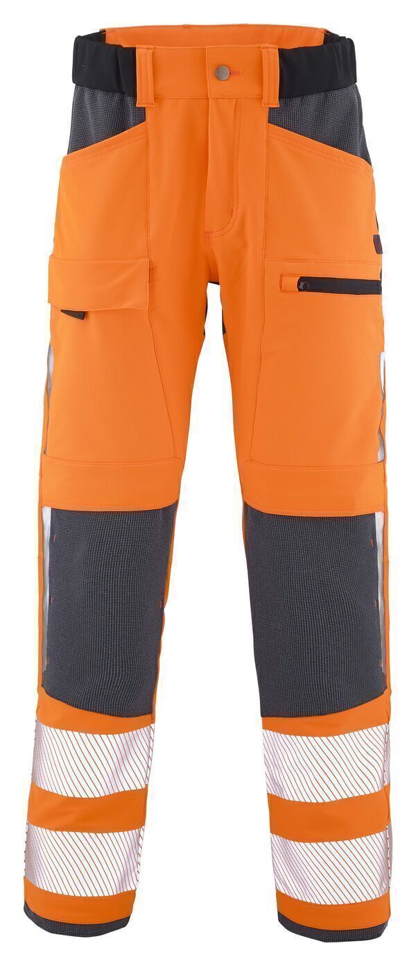 Pantalon de travail stretch haute visibilité. Ceinture 5 passants, élastiquée en bord-côte aux côtés, fermée par bouton rivet et fermeture à glissière. 2 poches italiennes. Poche cuisse gauche passepoilée zippée. Poche cuisse droite rabat fermée par Velcro® et en tirette. 2 Poches genoux fermeture Velcro®. Transferts rétroréfléchissants côtés genoux. 2 poches dos incrustées. Poche mètre dos côté droit. | Bandes rétroréfléchissantes de 80 mm. E.J. : 82 cm (+5 cm)
