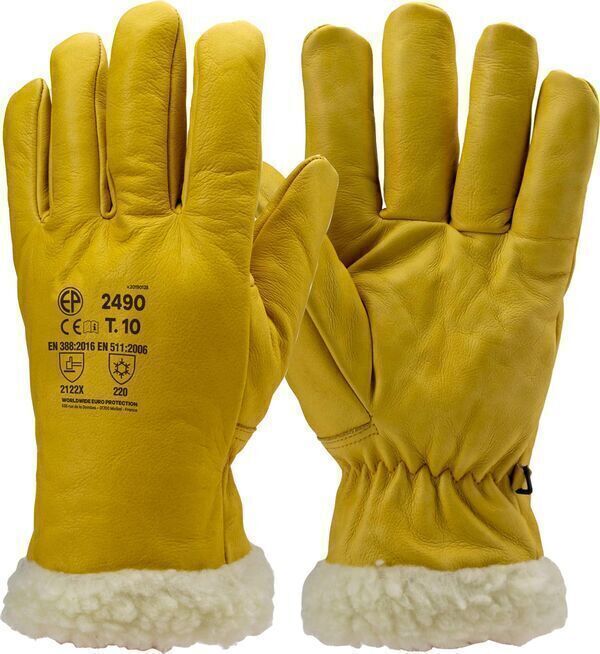 Gants cuir tout fleur de vachette supérieure. Doublure fourrée synthétique polyamide moutonnée. Élastique de serrage au poignet. | Longueur totale : 32 cm.
