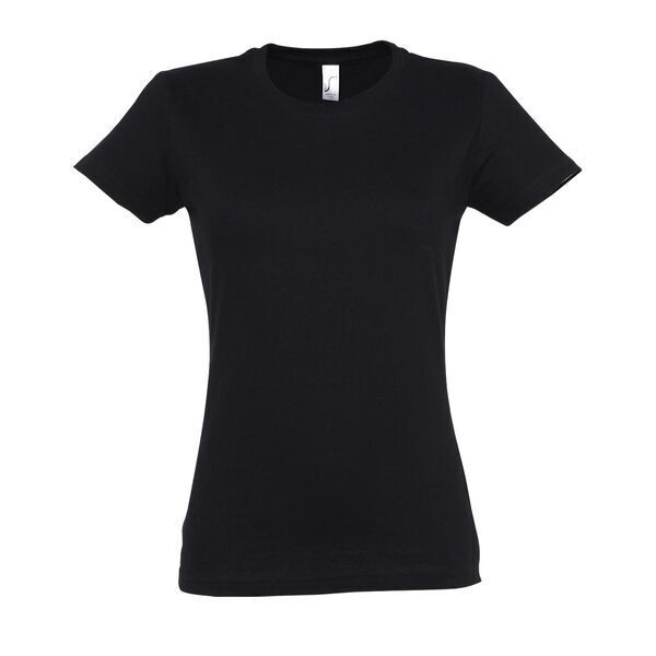 T-shirt femme. Col rond bord-côte avec élasthanne. Bande de propreté au col. Manches courtes. | Structure tubulaire. Coton semi-peigné Ringspun. Coupé cousu.