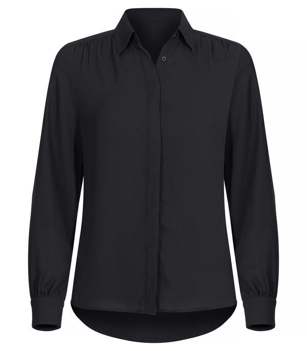 Chemisier femme fluide. Col chemisier. Fermeture milieu devant par boutons sous patte. Empiècement épaule, fronces sur le devant et plis creux dos. Manches longues, finition par poignets rapportés.