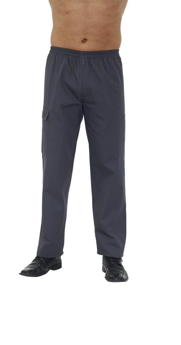 Pantalon homme. Ceinture élastiquée, braguette zip. 1 poche BIP cuisse gauche, 1 poche à soufflet avec rabat cuisse droite. E.J. : 82 cm.