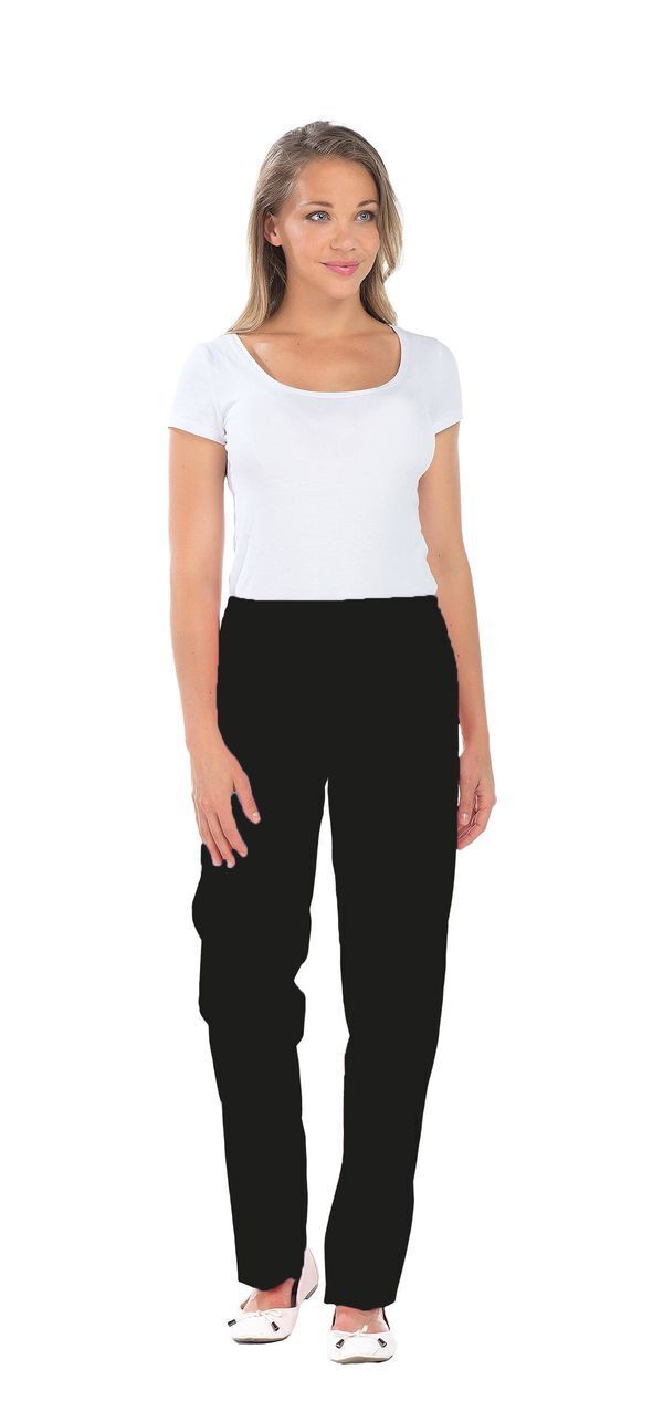 Pantalon femme. Taille semi-élastiquée effet ventre plat. 2 poches italiennes. E.J. : 82 cm.