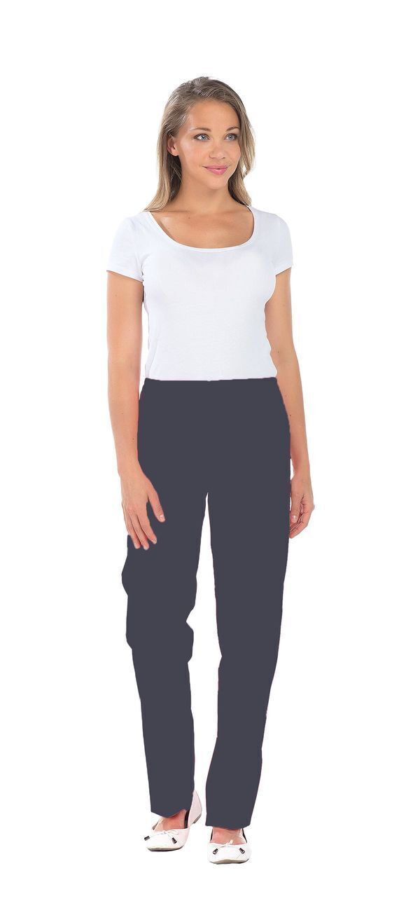 Pantalon femme. Taille semi-élastiquée effet ventre plat. 2 poches italiennes. E.J. : 82 cm.