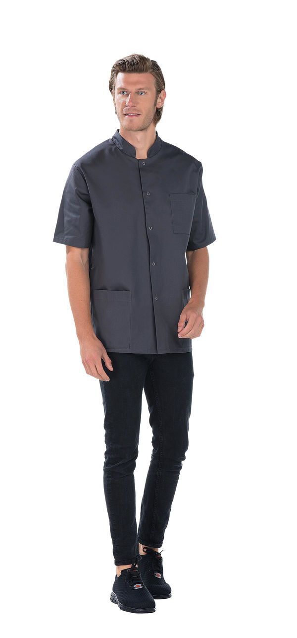 Tunique mixte. Col mao. Fermeture milieu devant par boutons-pression. 2 poches basses. Poche poitrine. Manches courtes. Fentes côtés. Longueur : 75 cm.