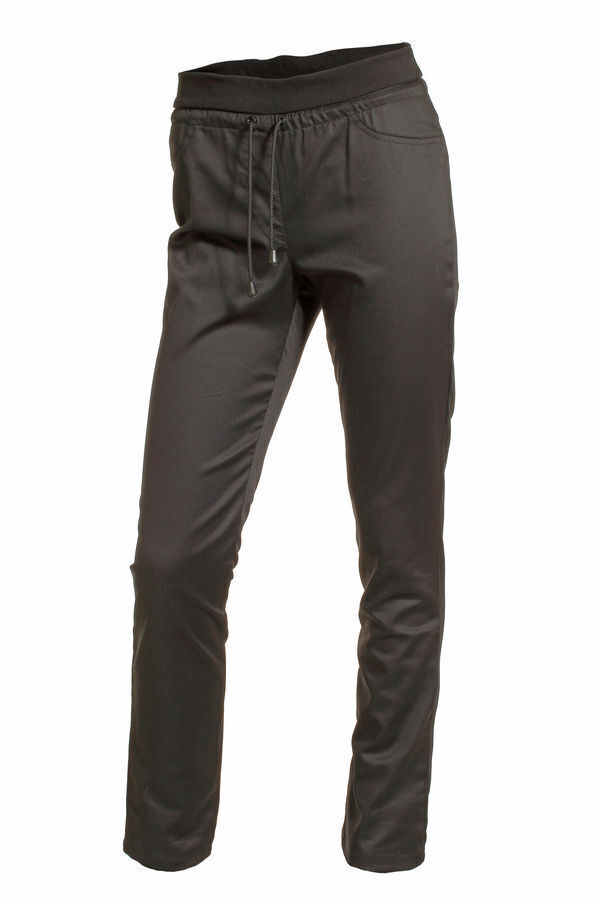 Pantalon femme. Ceinture en bord-côte élastiquée. Cordon de serrage à la taille. Fausses poches cavalières. Surpiqûres effet braguette. Rehausse dos style jeans. E.J. : 80 cm.