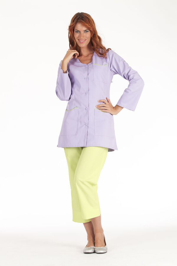 Tunique femme. Encolure fantaisie ton sur ton. Fermeture milieu devant par 5 pressions ton sur ton. 2 poches basses plaquées avec passepoil contrasté. Manches transformables. Coupe cintrée. Longueur : 80 cm.