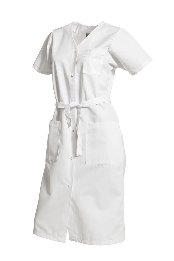 Blouse femme encolure V. Fermeture milieu devant par 6 grippers. Ceinture amovible. Poche poitrine et 2 poches basses plaquées. Manches courtes avec pattes pressionnées. Longueur : 105 cm.