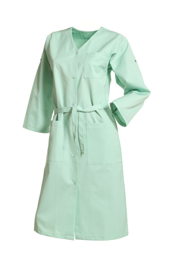 Blouse femme encolure V. Fermeture milieu devant par 6 grippers. Ceinture amovible. Poche poitrine et 2 poches basses plaquées. Manches transformables avec pattes pressionnées. Longueur : 105 cm.