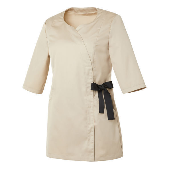Tunique à encolure fantaisie. Fermeture asymétrique par grippers cachés et nœud fantaisie sur le côté gauche. Découpes bretelles devant et pinces dos. Poches basses dans découpes devant. Poche stylo côté droit. Manches 3/4 avec fentes bas de manches. Fentes d'aisances côtés. Longueur : 75 cm.