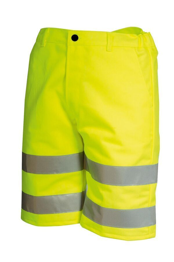Bermuda haute visibilité. Ceinture élastiquée côtés, fermée par fermeture à glissière et bouton. Poches italiennes. Poche dos plaquées. Bandes de 50 mm rétroréfléchissantes.